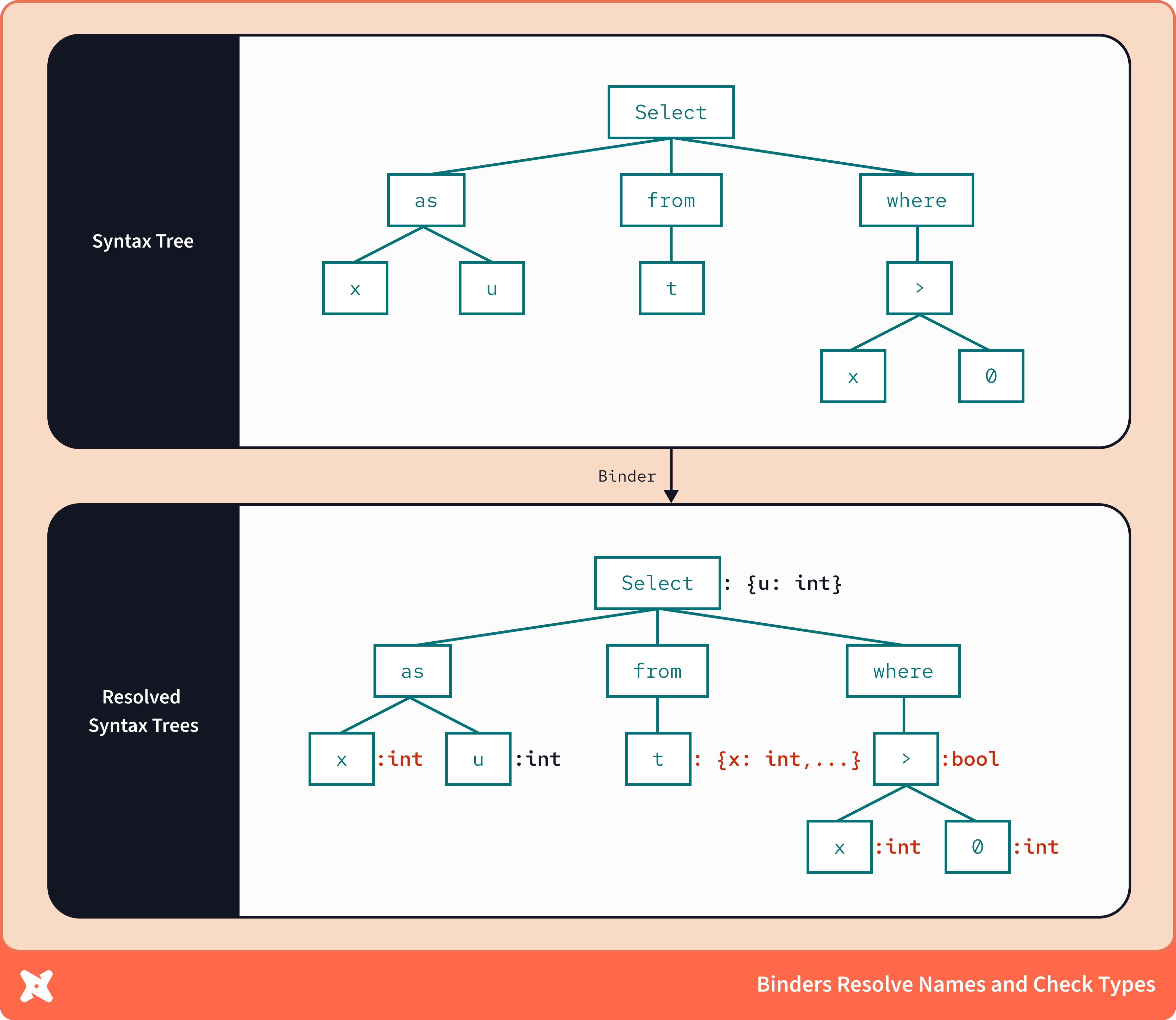 In the case of SQL binders, a major part of its job is to add warehouse schema information, like column datatypes, with the type signatures of warehouse operators described by the syntax tree to bring full type awareness to the syntax tree. It’s one thing to recognize a substring